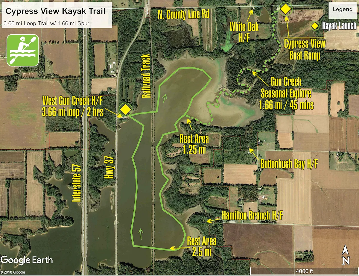 The Cypress View Section can be accessed from two launch areas. The West Gun Creek Hunter/Fisherman Parking lot along Highway 37 will access the loop section directly. If you would like to start along the Gun Creek section of the trail, you can launch at the Cypress View Boat Ramp off of North County Line Road. Water and restrooms are not available at either launch, so please plan ahead.