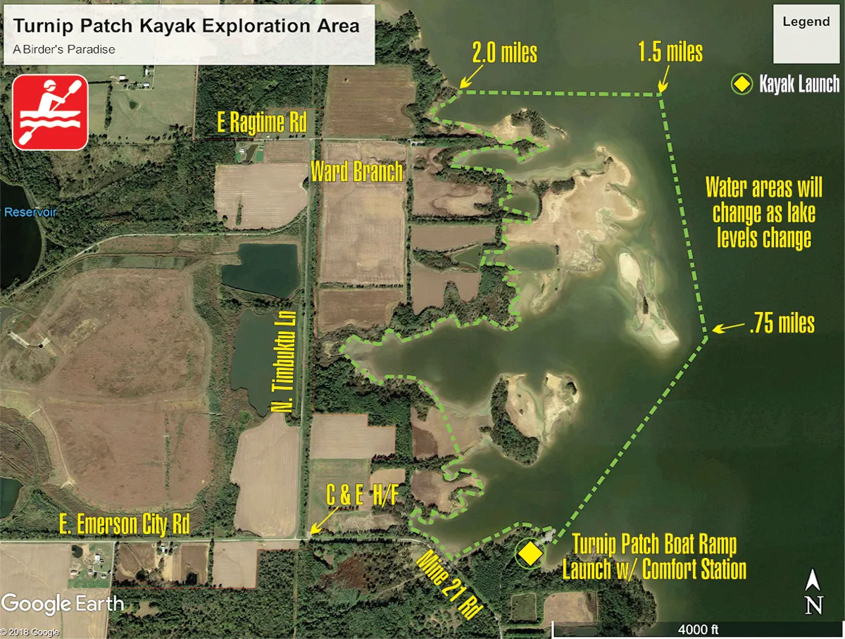 The Turnip Patch Exploration Area less of a loop trail and more of an area to explore between Turnip Patch and Ward Branch at your leisure. This area is very lake level dependent and can change dramatically. One day you may paddle past an island and into a cove that at lower water levels is a field and a point. It is this dynamic difference that makes this area one of the premiere locations on Rend Lake to see waterfowl and shorebirds of all kinds and worth possibly bringing binoculars and a camera along.