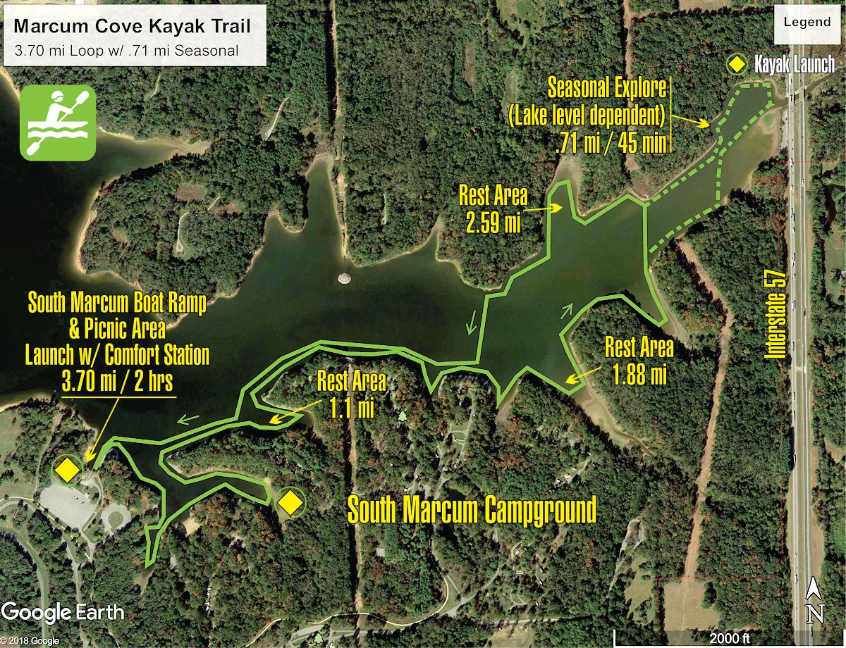 This section can be accessed from the South Marcum Boat Ramp and is the in the cove adjacent to the South Marcum Picnic Area and the South Marcum Campground. The launch has a comfort station and water available. The adjacent picnic area offers picnic tables and a playground. For those who are camping in South Marcum Campground, there is access to the trail at several boat mooring areas.