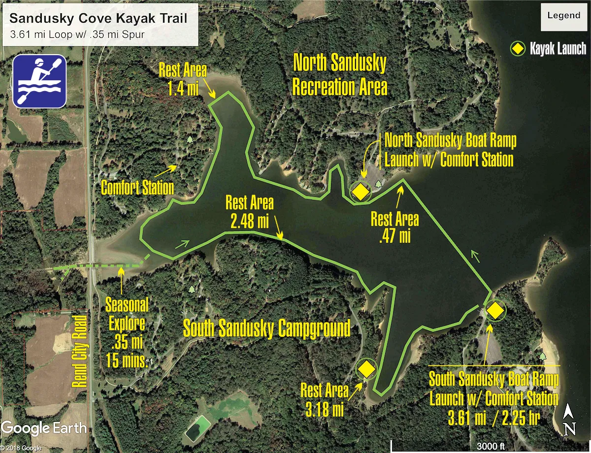 You can access the Sandusky Cove Section from either the North Sandusky Boat Ramp or South Sandusky Boat Ramp. Both launches offer a comfort station and water near the ramp. If you are camping in South Sandusky Campground, you can also access the trail at the boat mooring area near the Sycamore loop.