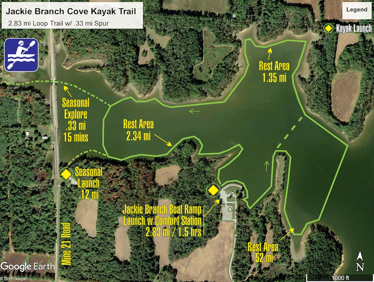 The Jackie Branch Section offers a loop that offers both open water and shoreline paddling. If the winds are affecting the lake, you can cut out the open water portion and head directly north across the cove from the end of the breakwater. It also features an exciting seasonal spur to explore up Jackie Branch to see a beaver hut, birds, and some great fishing areas when the crappie are spawning.