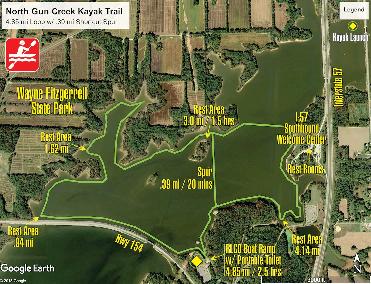 The North Gun Creek Section includes the area is north of Hwy 154, east of Wayne Fitzgerrell State Park, and west of I-57. This trail section can be accessed from the RLCD North Gun Creek Boat Ramp which is adjacent to the new Buck and Bass Cabins and just north of the intersection of Hwy154 and Gun Creek Trail. This section allows for quick access from Exit 77 of I-57. A portable toilet is available at the RLCD Boat Ramp. If you continue on the full trail, the Southbound Welcome Center offers a picnic area to take a break, get a drink, and have a picnic if you are interested.
